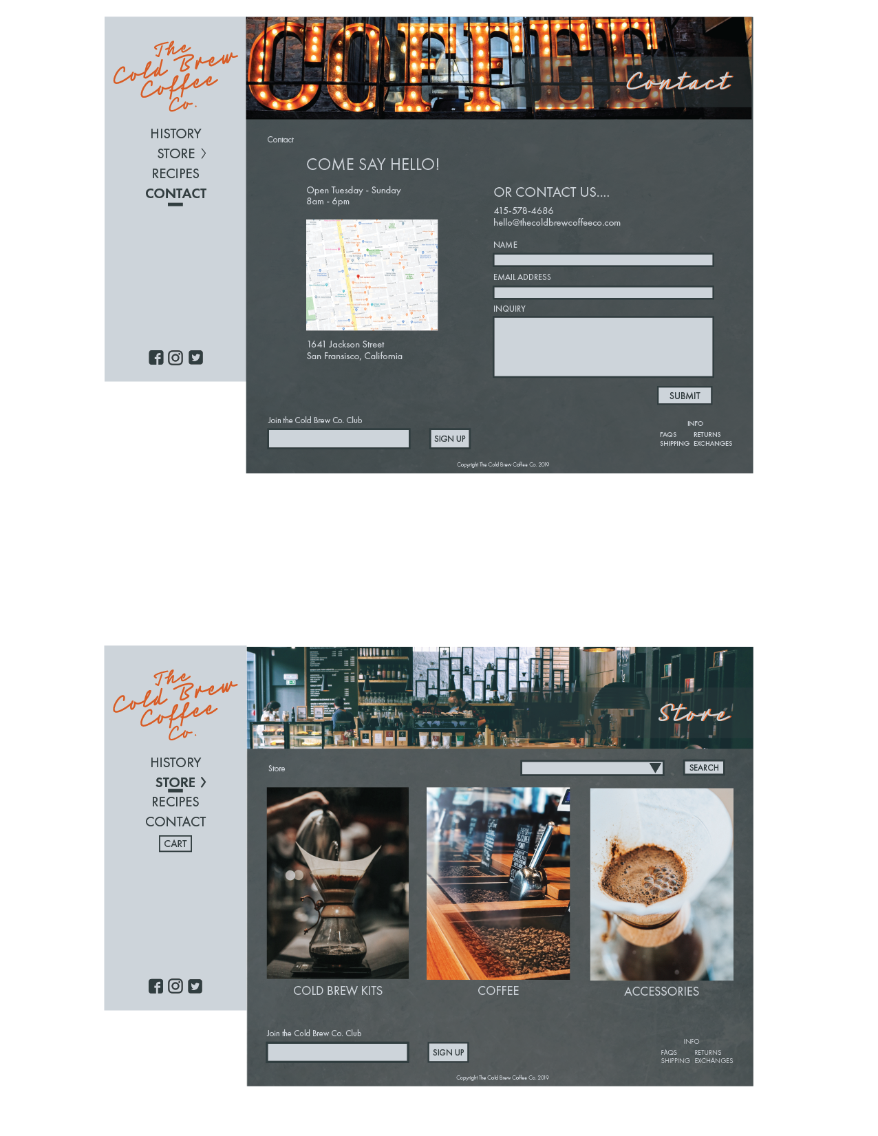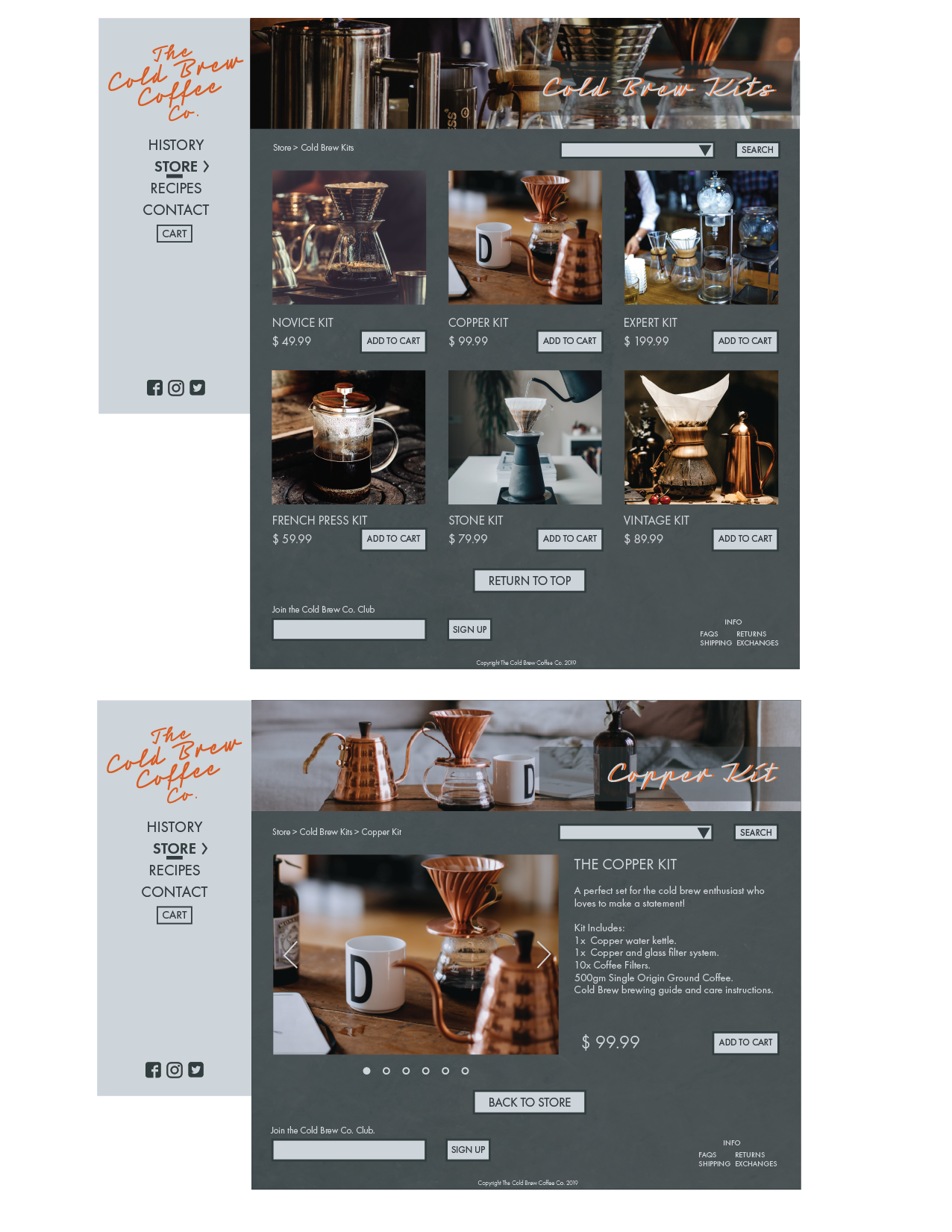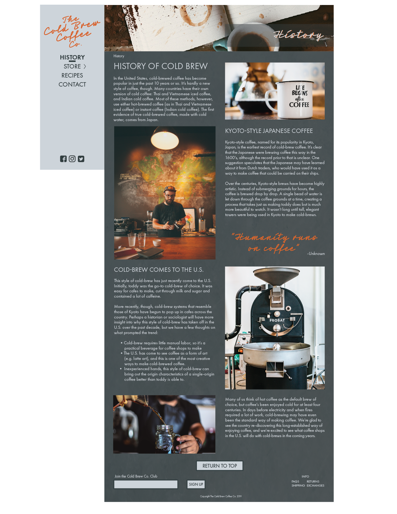 The purpose of this project was to create a website for a fictional Cold Brew Coffee Company. The site aims to serve as an online store for the company to sell Cold Brew kits for the audience to brew coffee at home, a place for users to learn more about the history of cold brew and get to know the company.