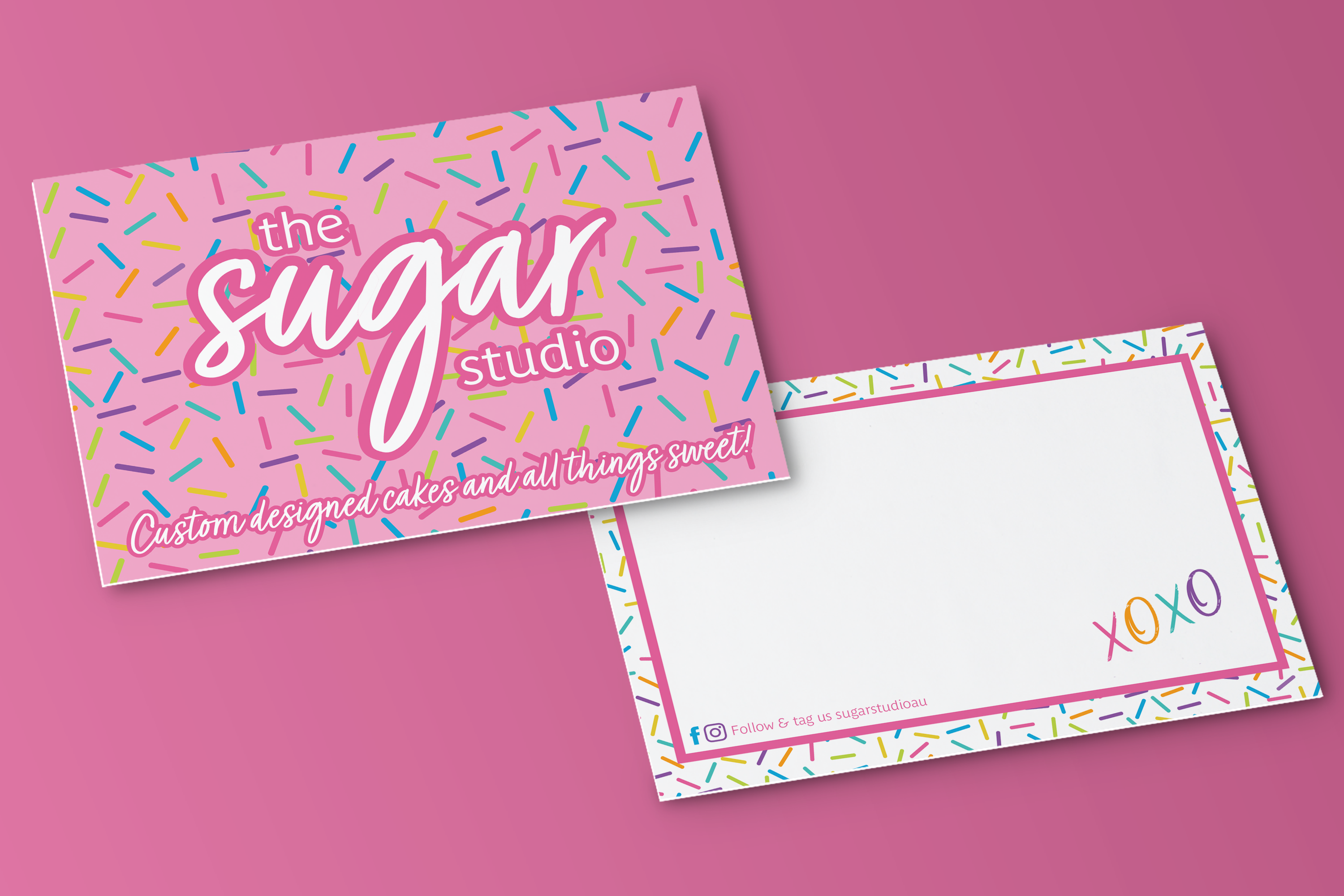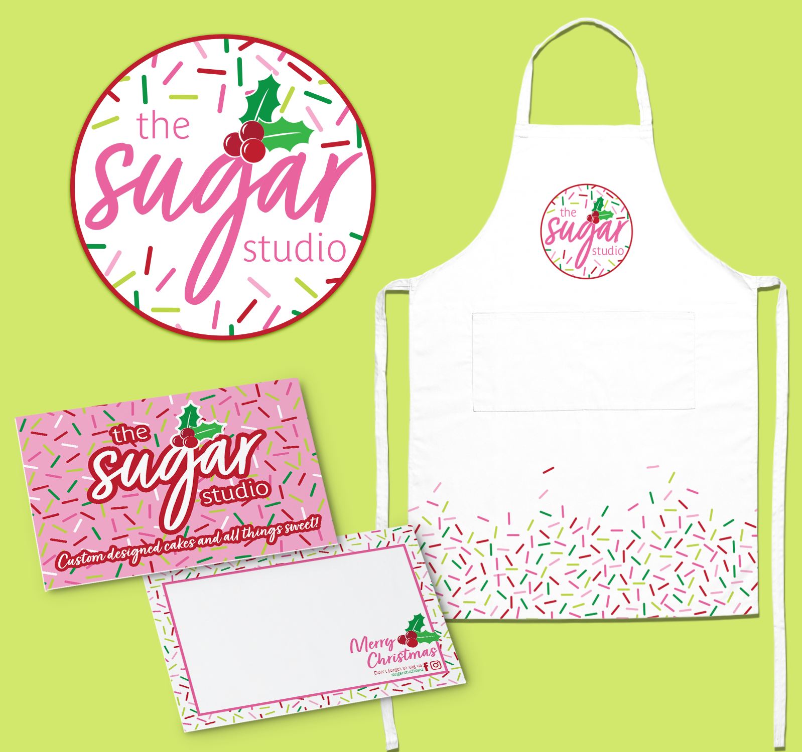 An up and coming cake store, The Sugar Studio wanted to capture the idea of all things sweet in a fun, modern and eyecatching way. The logo was inspired by the owner’s love of the amazing Amina Mucciolo of Studio Mucci. It was important for the logo of the business to suit all of the different styles of cakes that the studio creates, from 1st birthday cakes, 80th birthday cakes or traditional wedding cakes, the pastel and soft tones capture all moments along with the fun and sweet personality of the owner. As the Christmas season approaches, The Sugar Studio is launching Christmas themed sweet boxes, to suit, the logo, calling cards and merchandise were all slightly altered to match the colours of the sprinkles and icing on the treats inside.